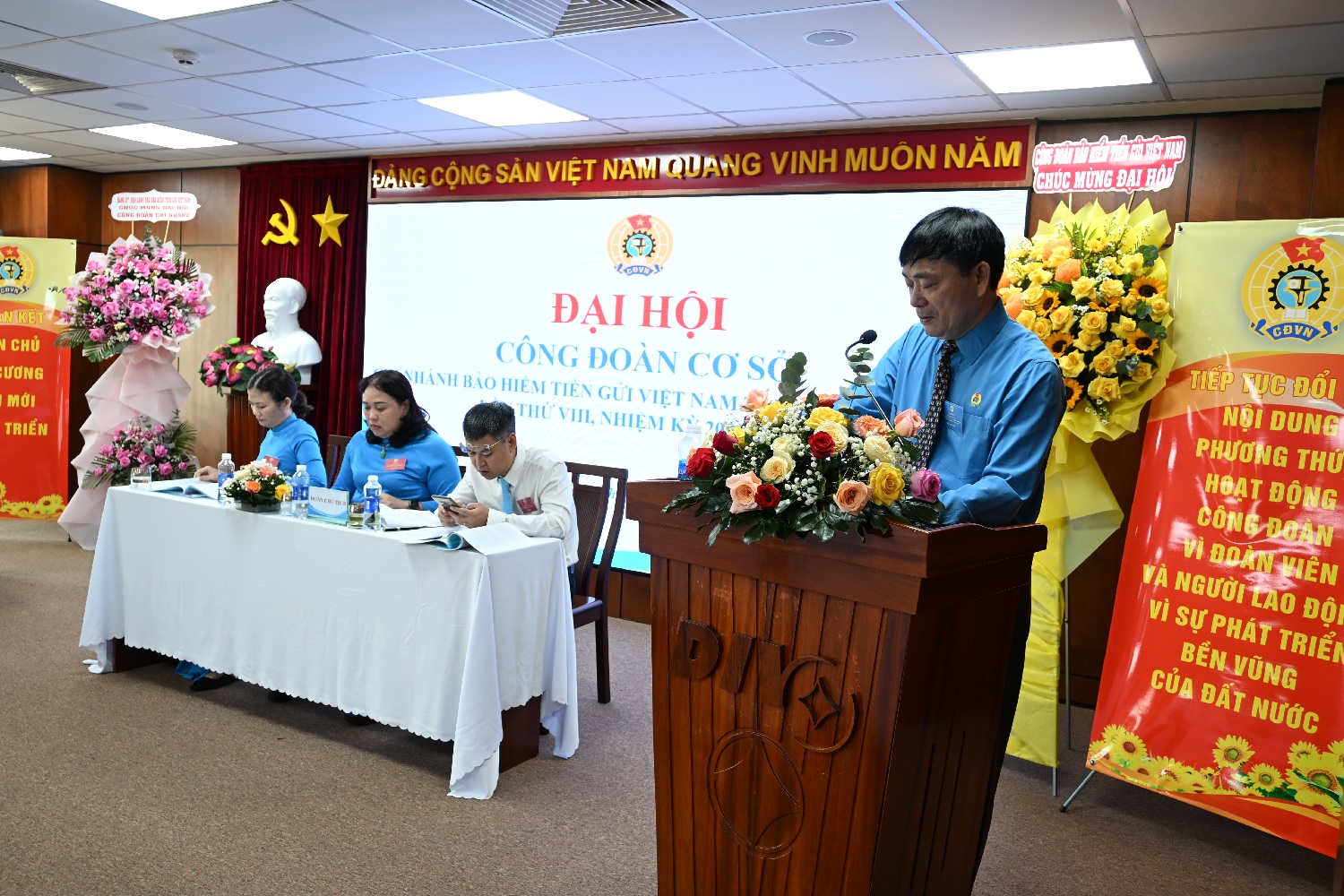 Tham dự Đại hội có ông Ngô Quang Lương – Ủy viên Ban Thường vụ Đảng ủy, Ủy viên Ban Chấp hành Công đoàn Ngân hàng Việt Nam, Thành viên chuyên trách Hội đồng quản trị (HĐQT), Chủ tịch Công đoàn BHTGVN; bà Nguyễn Thị Hiền - Ủy viên Ban Chấp hành Đảng bộ, Thành viên chuyên trách HĐQT BHTGVN; ông Dương Quốc Long - Ủy viên Ban Chấp hành Đảng bộ, Phó Tổng Giám đốc BHTGVN; đại diện lãnh đạo Văn phòng Đảng ủy BHTGVN, Cơ quan thường trực Công đoàn, Ban nữ công Công đoàn BHTGVN.
