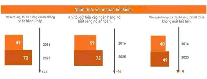 Kết quả năm 2025 khẳng định mức độ tin cậy cao: Có 72% người tham gia khảo sát tin tưởng vào hệ thống ngân hàng, tăng 23% so với năm 2016. Có 75% người dân cảm thấy tin tưởng về độ an toàn của tiền gửi tại ngân hàng, tăng 16% so với năm 2016. Khảo sát cũng cho biết, 49% công chúng nhận biết được rằng họ sẽ không mất hết tiền nếu ngân hàng bị đổ vỡ, tăng 9% so với năm 2016.