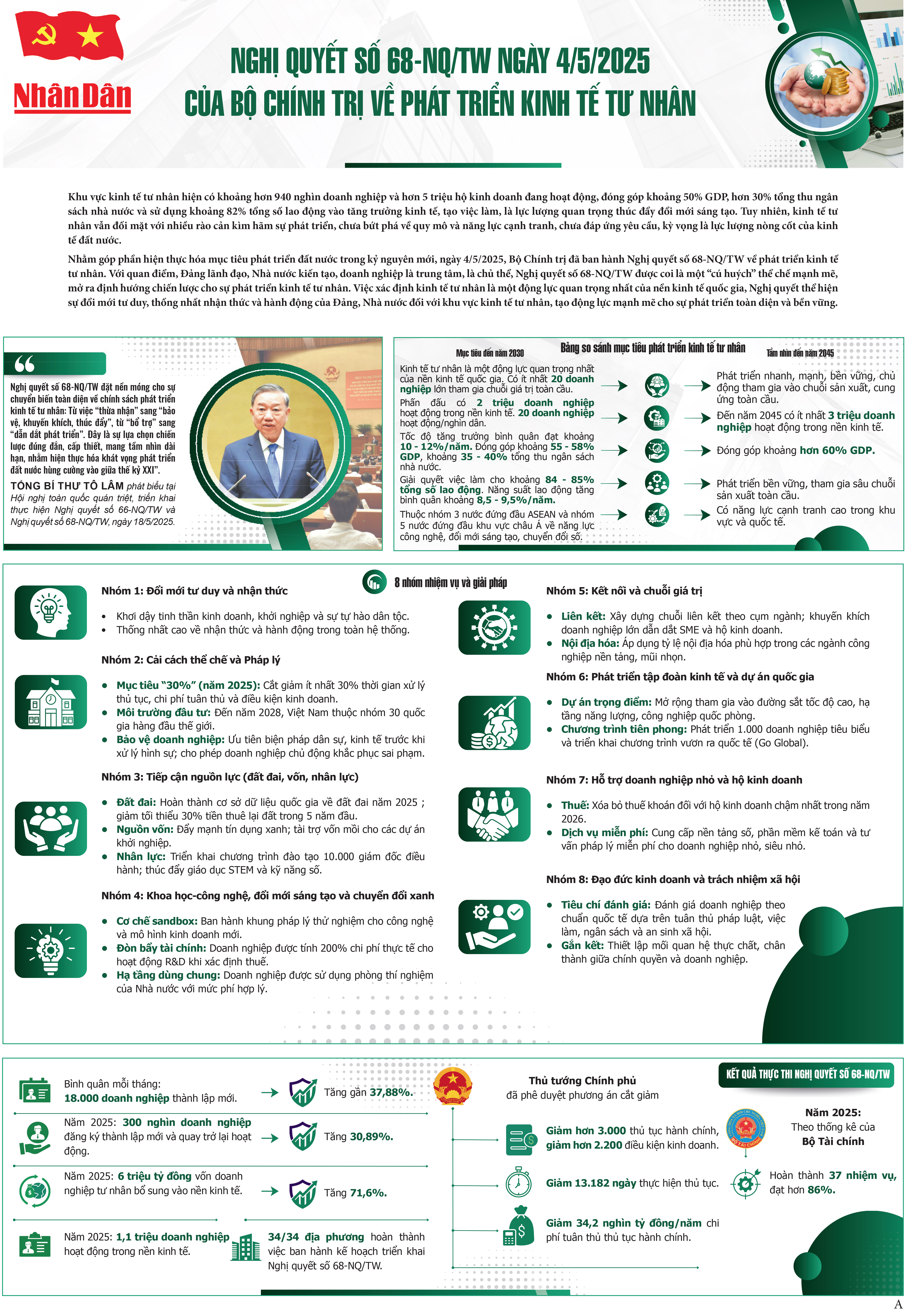 Khu vực kinh tế tư nhân hiện có khoảng hơn 940 nghìn doanh nghiệp và hơn 5 triệu hộ kinh doanh đang hoạt động, đóng góp khoảng 50% GDP, hơn 30% tổng thu ngân sách nhà nước và sử dụng khoảng 82% tổng số lao động vào tăng trưởng kinh tế, tạo việc làm, là lực lượng quan trọng thúc đẩy đổi mới sáng tạo. Tuy nhiên, kinh tế tư nhân vẫn đối mặt với nhiều rào cản kìm hãm sự phát triển, chưa bứt phá về quy mô và năng lực cạnh tranh, chưa đáp ứng yêu cầu, kỳ vọng là lực lượng nòng cốt của kinh tế đất nước.