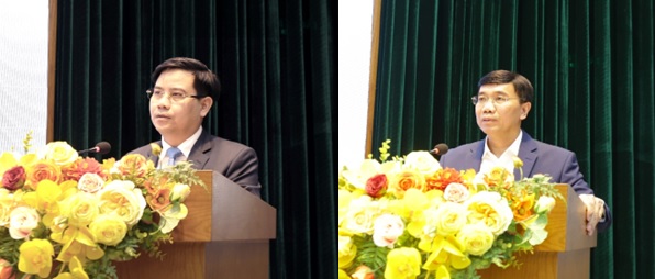 Ông Lê Anh Xuân - Giám đốc NHNN Chi nhánh khu vực 9 và ông Nguyễn Đức Đồng - Phó Giám đốc NHNN Chi nhánh khu vực 8 phát biểu tại Hội nghị.