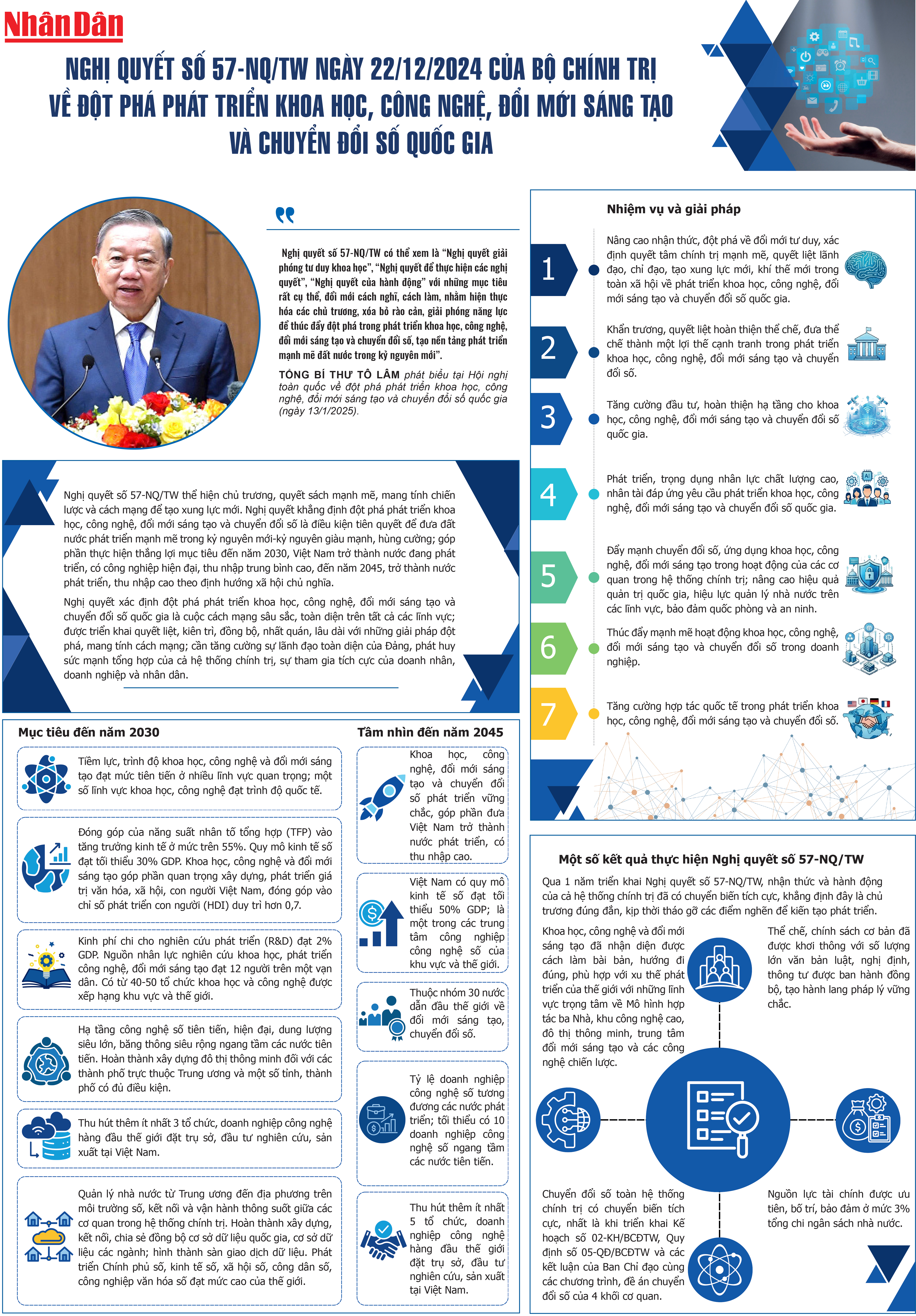 Nghị quyết số 57-NQ/TW có thể xem là “Nghị quyết giải phóng tư duy khoa học”, “Nghị quyết để thực hiện các nghị quyết”, “Nghị quyết của hành động” với những mục tiêu rất cụ thể, đổi mới cách nghĩ, cách làm, nhằm hiện thực hóa các chủ trương, xóa bỏ rào cản, giải phóng năng lực để thúc đẩy đột phá trong phát triển khoa học, công nghệ, đổi mới sáng tạo và chuyển đổi số, tạo nền tảng phát triển mạnh mẽ đất nước trong kỷ nguyên mới”. Tổng Bí thư Tô Lâm phát biểu tại Hội nghị toàn quốc về đột phá phát triển khoa học, công nghệ, đổi mới sáng tạo và chuyển đổi số quốc gia (ngày 13/1/2025).