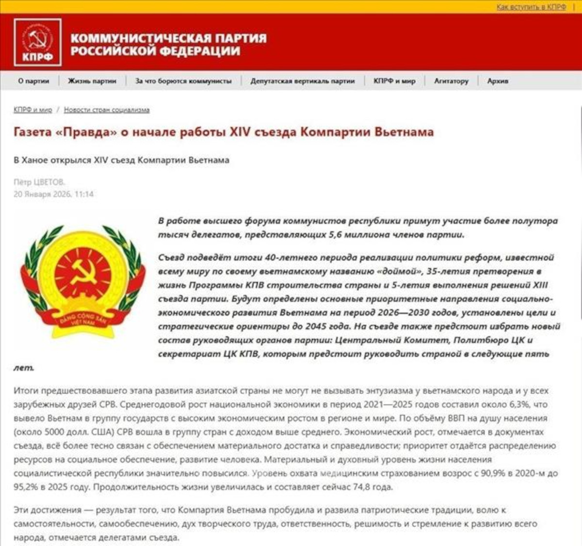 Trang web của Đảng Cộng sản Liên bang Nga (kprf.ru) ngày 20/1/2026 đưa tin về Đại hội Đại biểu toàn quốc lần thứ XIV (Đại hội XIV) của Đảng Cộng sản Việt Nam